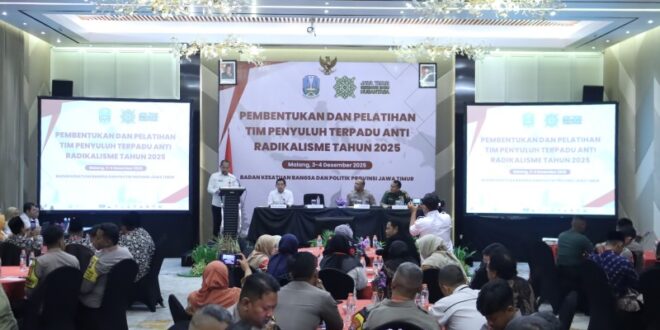 Jatim — Pemerintah Provinsi Jawa Timur melalui Badan Kesatuan Bangsa dan Politik (Bakesbangpol) menggelar Pembentukan dan Pelatihan Tim Penyuluh Terpadu Anti Radikalisme Tahun 2025 di Kota Malang, Rabu (3/12/2025). Kegiatan ini dibuka langsung oleh Kepala Bakesbangpol Jatim, Eddy Supriyanto, dan diikuti ratusan peserta dari unsur penyuluh agama, Babinsa, Bhabinkamtibmas, serta perwakilan pemerintah daerah.