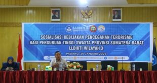 Padang — Perguruan tinggi dinilai memiliki peran strategis dalam membentuk karakter dan cara berpikir generasi muda, sehingga harus menjadi ruang aman dari pengaruh paham ekstrem. Atas dasar itu, Lembaga Layanan Pendidikan Tinggi (LLDIKTI) Wilayah X menggandeng Densus 88 Antiteror Polri menggelar sosialisasi pencegahan terorisme bagi pengelola perguruan tinggi swasta se-Sumatera Barat, Senin (26/1/2026). Kegiatan yang berlangsung di Aula LLDIKTI Wilayah …