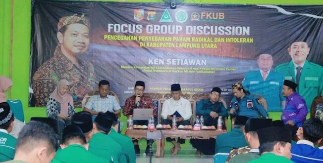 Lampung Utara – Gerakan Pemuda (GP) Ansor Lampung Utara menggelar Focus Group Discussion (FGD) bertema “Pencegahan Penyebaran Paham Intoleransi dan Radikalisme di Kabupaten Lampung Utara” di Pondok Pesantren Daarul Khair, Sabtu (23/8/2025).