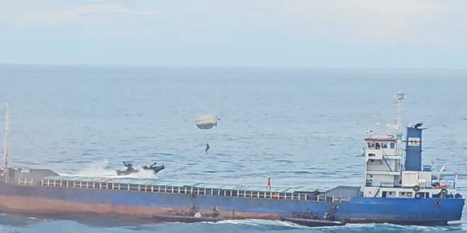 Dari udara, tiga personel Kopaska diterjunkan dengan parasut langsung ke dek kapal, disusul dukungan helikopter Pusat Penerbangan TNI AL (Puspenerbal) yang memberikan tembakan penggempur. Aksi bela diri jarak dekat turut dipamerkan saat pasukan melumpuhkan para teroris, hingga akhirnya KM Bravo berhasil direbut kembali.