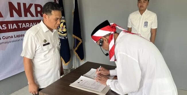 Tarakan — Seorang narapidana tindak pidana terorisme berinisial AM di Lembaga Pemasyarakatan (Lapas) Kelas IIA Tarakan mengucapkan ikrar setia kepada Negara Kesatuan Republik Indonesia (NKRI) dalam sebuah prosesi khidmat di Aula Serbaguna Lapas Tarakan, Kamis (6/11).