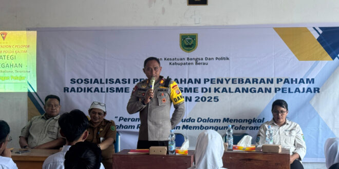 Berau — Dalam upaya membentengi generasi muda dari pengaruh paham ekstrem, personel Kompi 3 Batalyon C Pelopor Satbrimob Polda Kalimantan Timur menggelar sosialisasi kebangsaan di SMA PGRI 13 Berau, Senin (21/7/2025). Kegiatan ini menjadi bagian dari langkah preventif aparat untuk menanamkan nilai-nilai toleransi serta kesadaran akan bahaya radikalisme dan terorisme sejak usia sekolah.