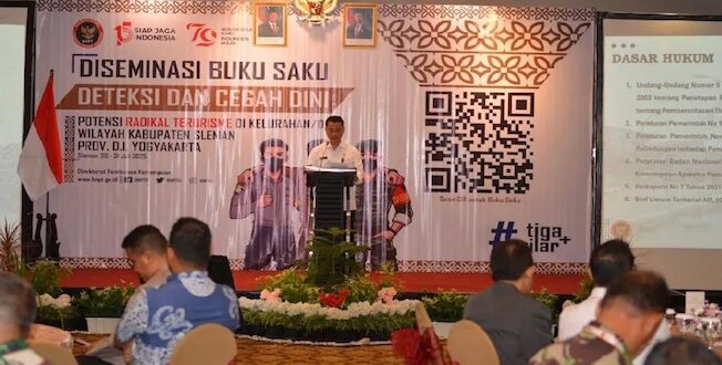 Sleman — Dalam upaya memperkuat ketahanan masyarakat terhadap ancaman radikalisme dan terorisme, Badan Nasional Penanggulangan Terorisme (BNPT) menggelar diseminasi buku saku deteksi dan pencegahan dini di Kabupaten Sleman, Daerah Istimewa Yogyakarta, pada 30–31 Juli 2025. Kegiatan ini menyasar para aparatur pemerintah di tingkat kalurahan, dengan fokus pada peran tiga pilar kewilayahan: lurah, Babinsa, dan Bhabinkamtibmas.